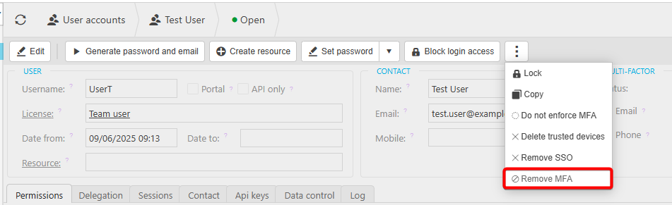 2. Click the ellipses and select Remove MFA. This will prompt a window asking to confirm if you wish to disable MFA and trusted devices for the user.