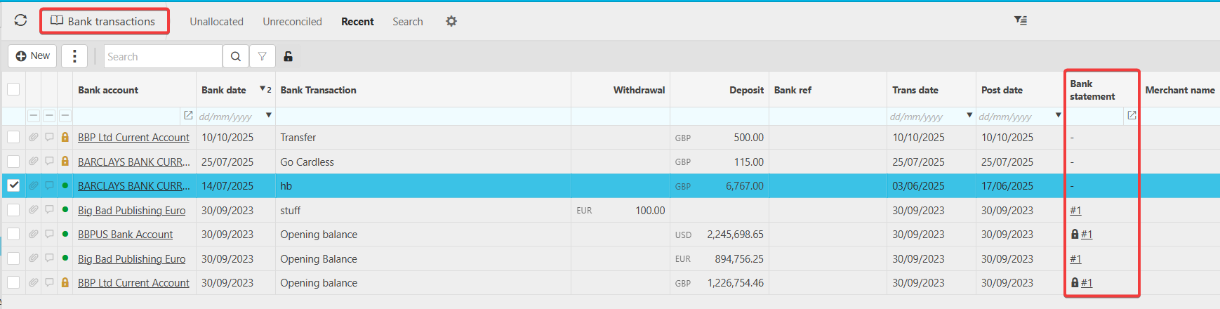 If the transaction is not assigned to any statement, the Bank Statement column will be blank.