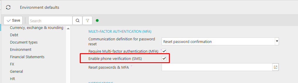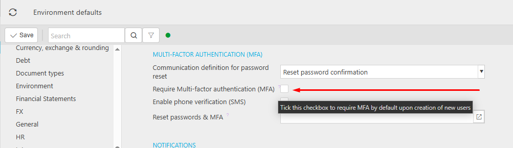 Multi-factor authentication can be enabled individually per user account, however, this can be set as a required feature through the environment default screen, under ‘Multi-factor authentication (MFA)' header.