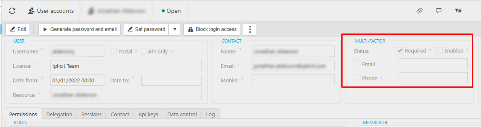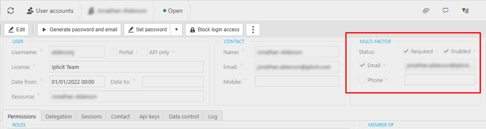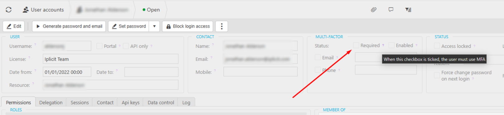 Upon accessing iplicit, the selected MFA details for SMS or email will be listed on the user account. Authenticator app verification is single use, and therefore is not listed on the user account.
