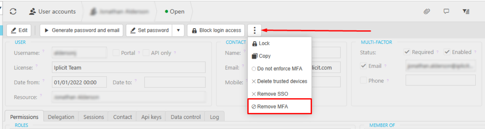 Any established MFA links can be removed from a user account by selecting the three dots on the top of the account, and ‘Removing MFA’.