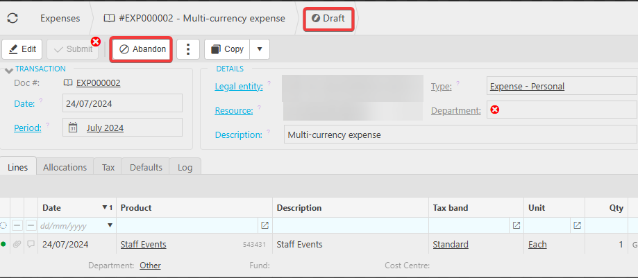 Deletion is available for draft expenses only, so use it for genuine errors rather than routine corrections.