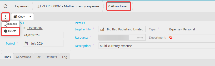 You can only delete an expense in iplicit when it's in draft status. If the expense has been posted, you need to return it to draft first. If it's been included in a VAT return or matched on a bank reconciliation, deletion isn't possible - you'll need to reverse it instead.