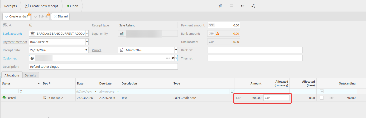 With the credit note posted, the next step in the Sales Ledger refund process is to create a sales refund document. The sales refund represents the actual payment leaving your bank account and going back to the customer.