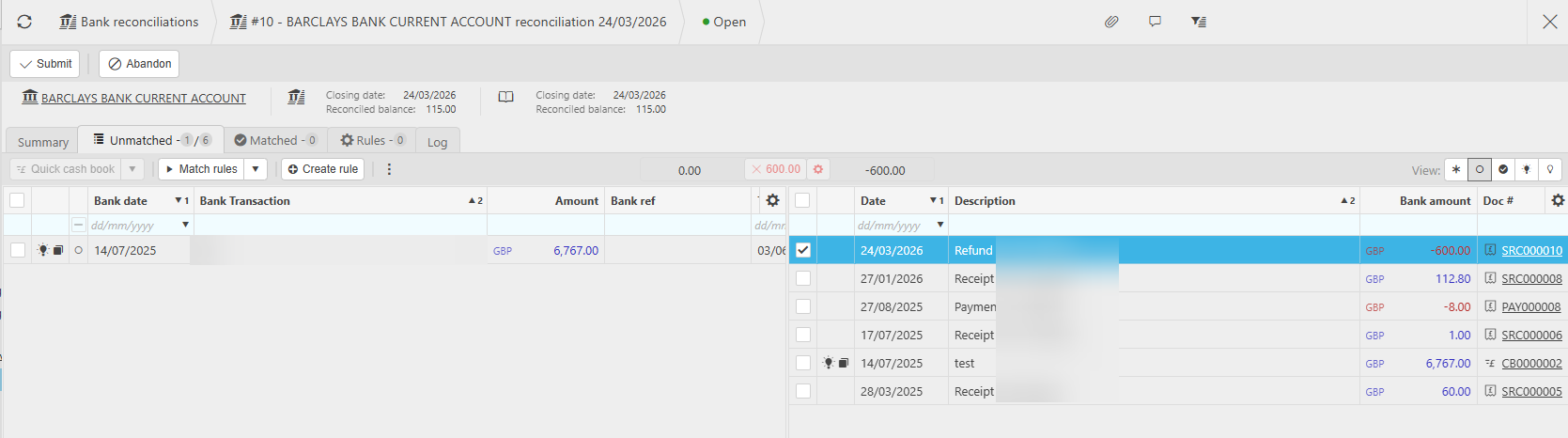 - Open the reconciliation for the relevant bank account and period.