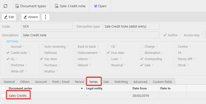 - Once unlocked, check that an appropriate document series is assigned to the document type. Without an active document series, you will not be able to create new documents of that type.