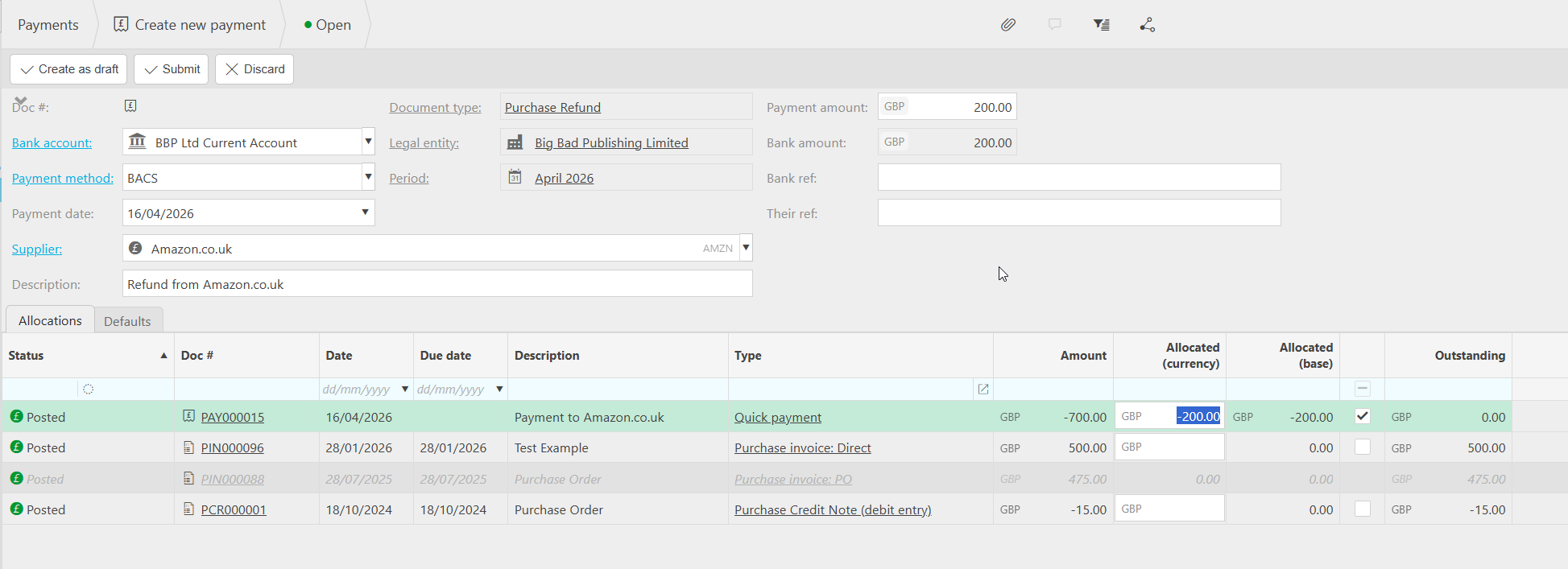 This method applies in both the Sales Ledger and the Purchase Ledger. When raising a refund document, any available payment documents - including overpayments - can be selected for allocation at the point of creation.