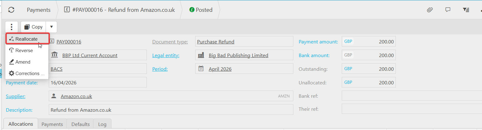 This article covers allocating a refund document against an existing payment document where there has been an overpayment. The process works the same way in both the Sales Ledger and the Purchase Ledger. There are two methods available - allocating when raising the refund document, or using the Reallocate function after the refund has been raised.