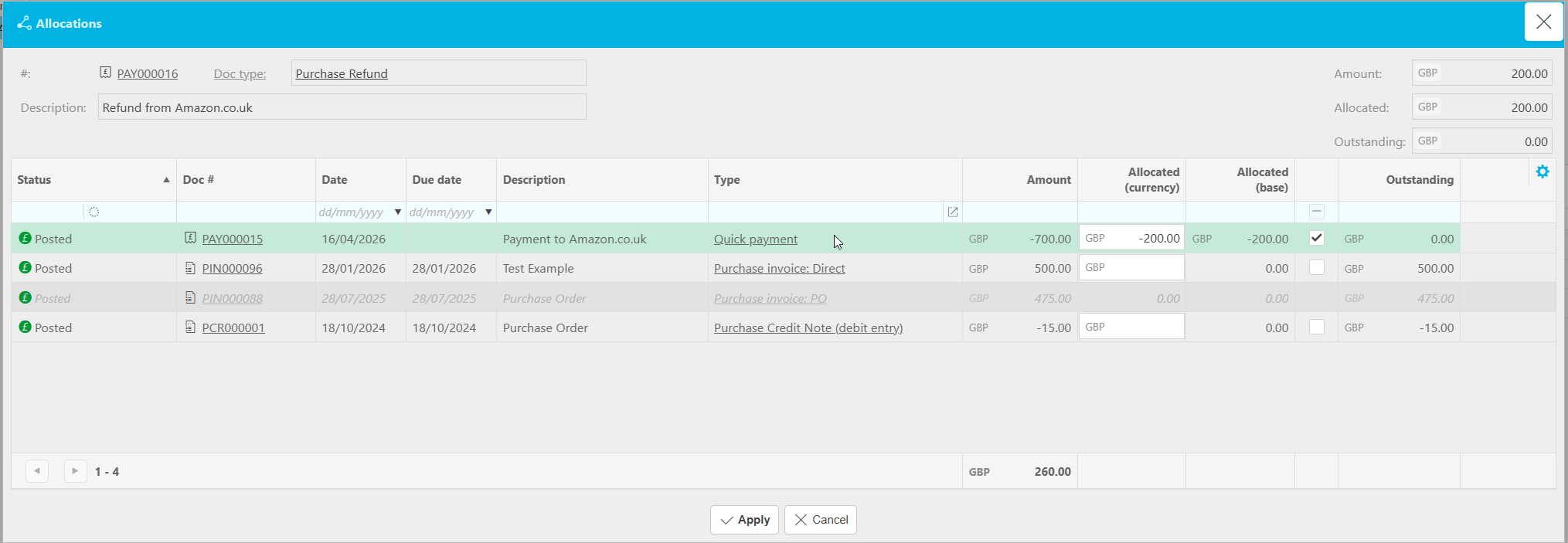 - You will see the available payment documents for that account, including any unallocated overpayments