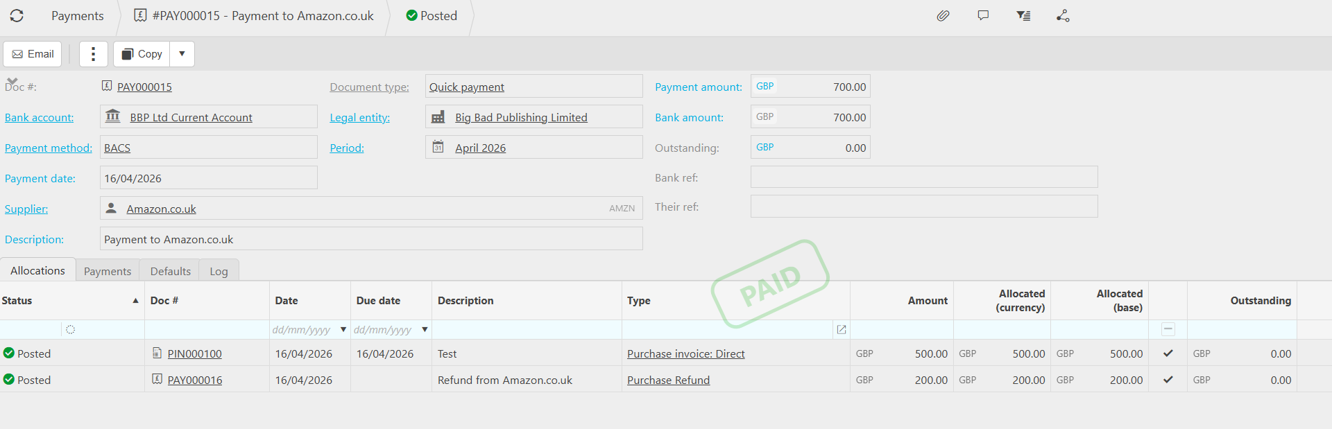 The refund document is now allocated against the overpayment. Both documents reflect the updated allocation status.